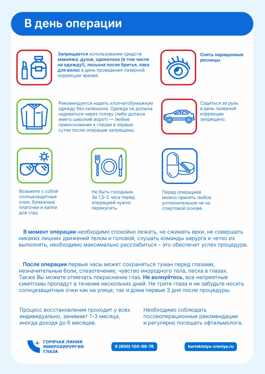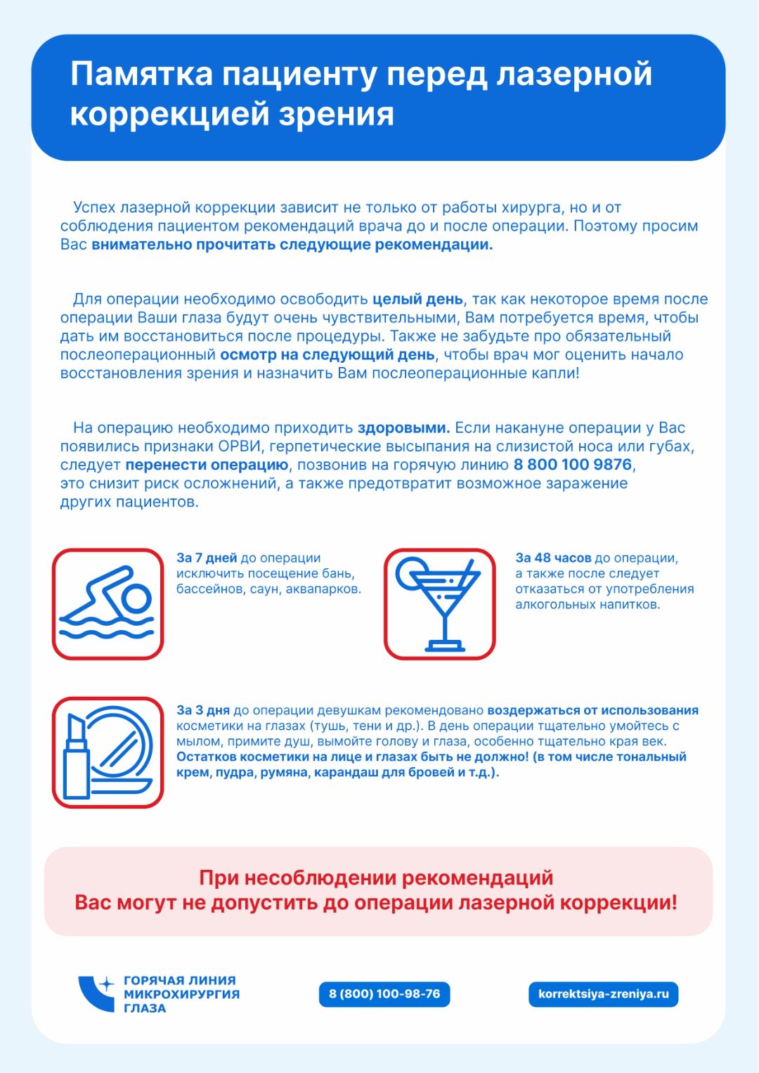 1) Отказаться от ношения контактных линз "мягких" – за 7 дней до диагностики/операции, "жестких" и "ночных" - за 3 месяца до операции.